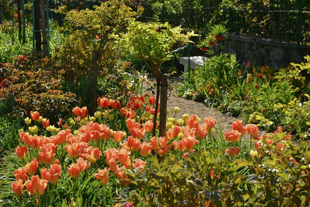 Dans le jardin devant la maison de Claude Monet, des pommiers en cordon bordent les parterres de fleurs bulbeuses.
