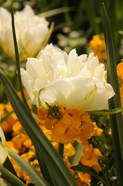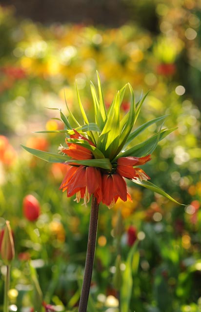 Cet hymne enthousiaste aux fleurs bulbeuses dans le Clos Normand : tulipe, narcisse, fritillaire…  des variétés extraordinaires dont les corolles doubles, froufroutantes, bien dessinées et des fleurs plus « campagne » lèchent le pied des sages pommiers en cordon et autres arbres fruitiers.