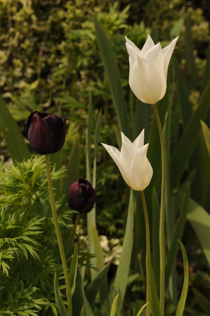 Des pommiers en cordon bordent les parterres de fleurs bulbeuses.