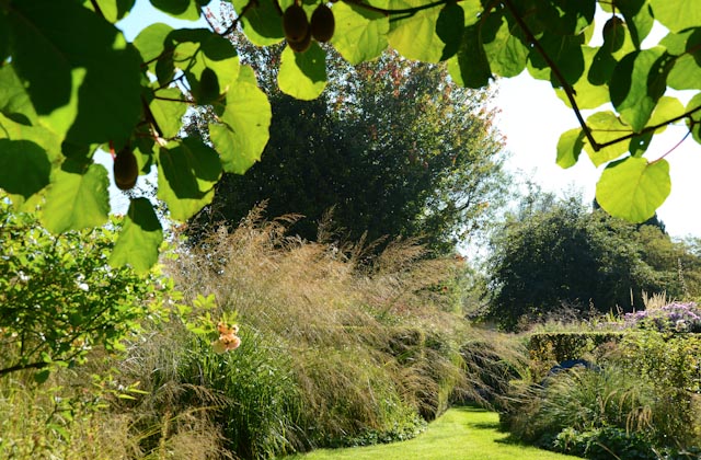 Enveloppées de charmilles, elles mêlent vivaces et graminées. Les haies taillées ne sont pas trop hautes pour ne pas enfermer le visiteur, mais suffisamment tout de même pour lui ménager des surprises. Les graminées donnent beaucoup de naturel aux massifs. Bien sûr, il faut qu’elles soient bien adaptées aux conditions climatiques. Aux trop grands miscanthus qui supportent mal le vent très fréquent dans la région, elle préfère les poas, particulièrement Poa labillardieri à la silhouette ébouriffée d’un bleu étonnant et les deschampsias aux épis si légers, parfaitement adaptés au terrain argileux du jardin. Elle plante aussi beaucoup de calamagrostis à la silhouette dressée plus raide façon chandelle. La légèreté des graminées, leur blondeur permettent d’associer n’importe quelles couleurs entre elles sans craindre la faute de goût.